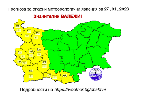Жълт код за дъжд и сняг е обявен за вторник (27 януари).Предупреждението е в сила за областите Видин, Монтана, Враца, София-област, София-град, Перник, Кюстендил, Благоевград, Пазарджик, Смолян и Кърджали.В планинските райони в Западна България ще вали сняг и ще се образува тънка снежна покривка. Вятърът ще е умерен до силен от юг-югоизток, но в западните райони от страната ще се ориентира от запад-северозапад, предимно умерен….