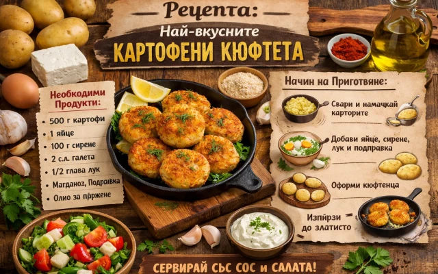 Картофените кюфтета са класика в българската кухня – семпли, ароматни и изключително засищащи. Те съчетават хрупкава коричка отвън и мека, пухкава сърцевина отвътре. Подходящи са както за основно ястие, така и за гарнитура или мезе. В тази статия ще ви представя изпита рецепта за наистина най-вкусните картофени кюфтета , които винаги се получават.Необходими продукти:1 кг картофи2 яйца150 г бяло сирене (по желание, но силно препоръчително)1 малка глава лук (настърган или ситно нарязан)2–3 с….