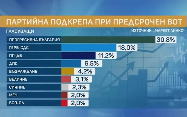 Новата коалиция „Прогресивна България“, оглавявана от бившия президент Румен Радев, получава 30,8% подкрепа и печели убедително предстоящите в неделя предсрочни парламентарни избори. На второ място се нарежда ГЕРБ-СДС с 18% от гласовете. Това показват данните от финалното проучване на електоралните нагласи, проведено от агенция „Маркет линкс“ съвместно с bTV, броени дни преди вота на 19 април….