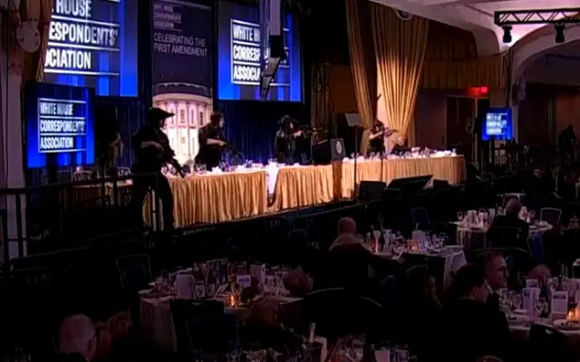 Президентът на САЩ Доналд Тръмп и първата дама Мелания Тръмп са били евакуирани от агенти на Сикрет Сървис от вечерята на Асоциацията на кореспондентите в Белия дом в събота вечерта, след като в залата са се чули силни изстрели, предаде Ройтерс.Video from the table of RFK Jr and Stephen Miller at tonight’s White House Correspondents’ Dinner. Pete Hegseth was spotted walking through the room….